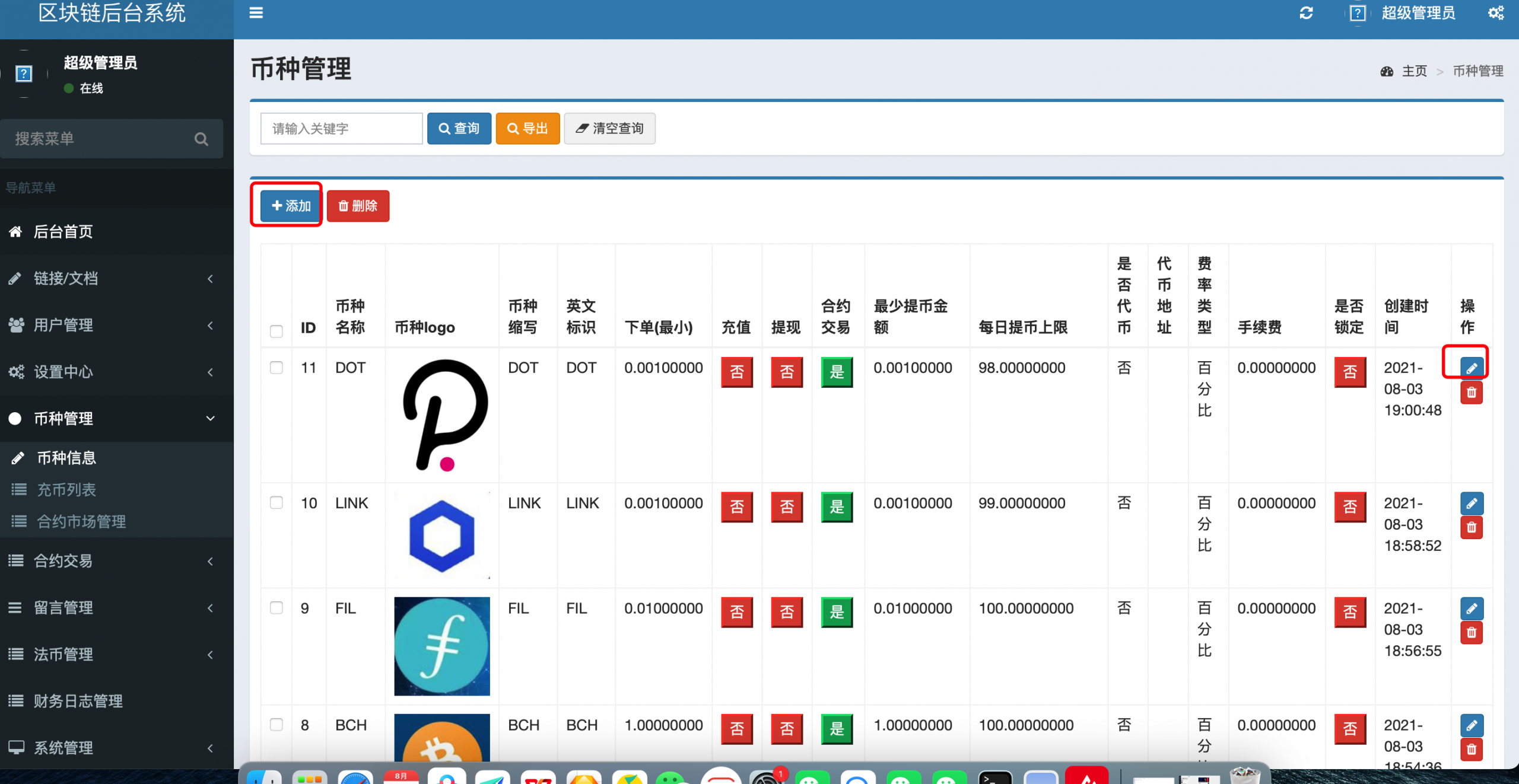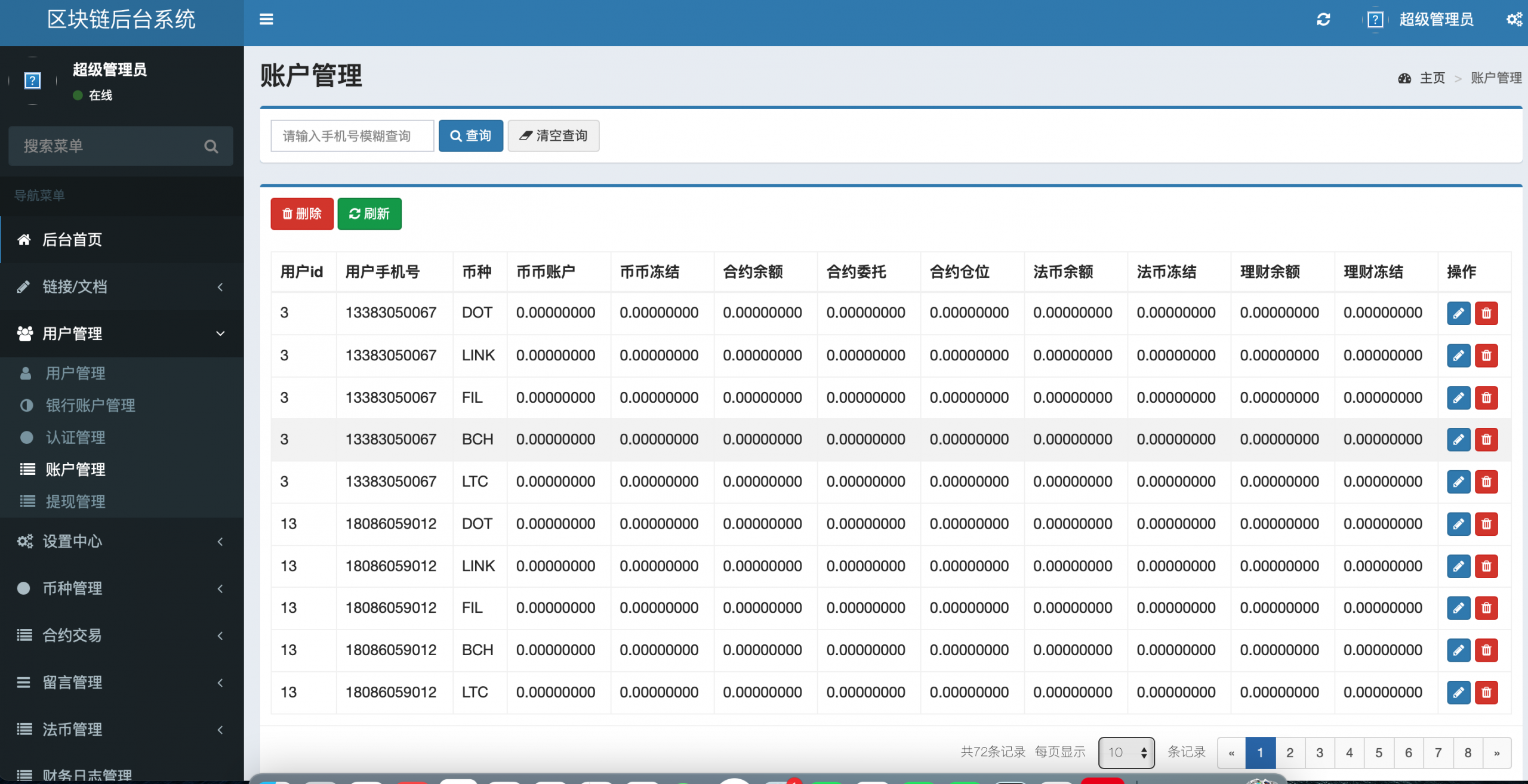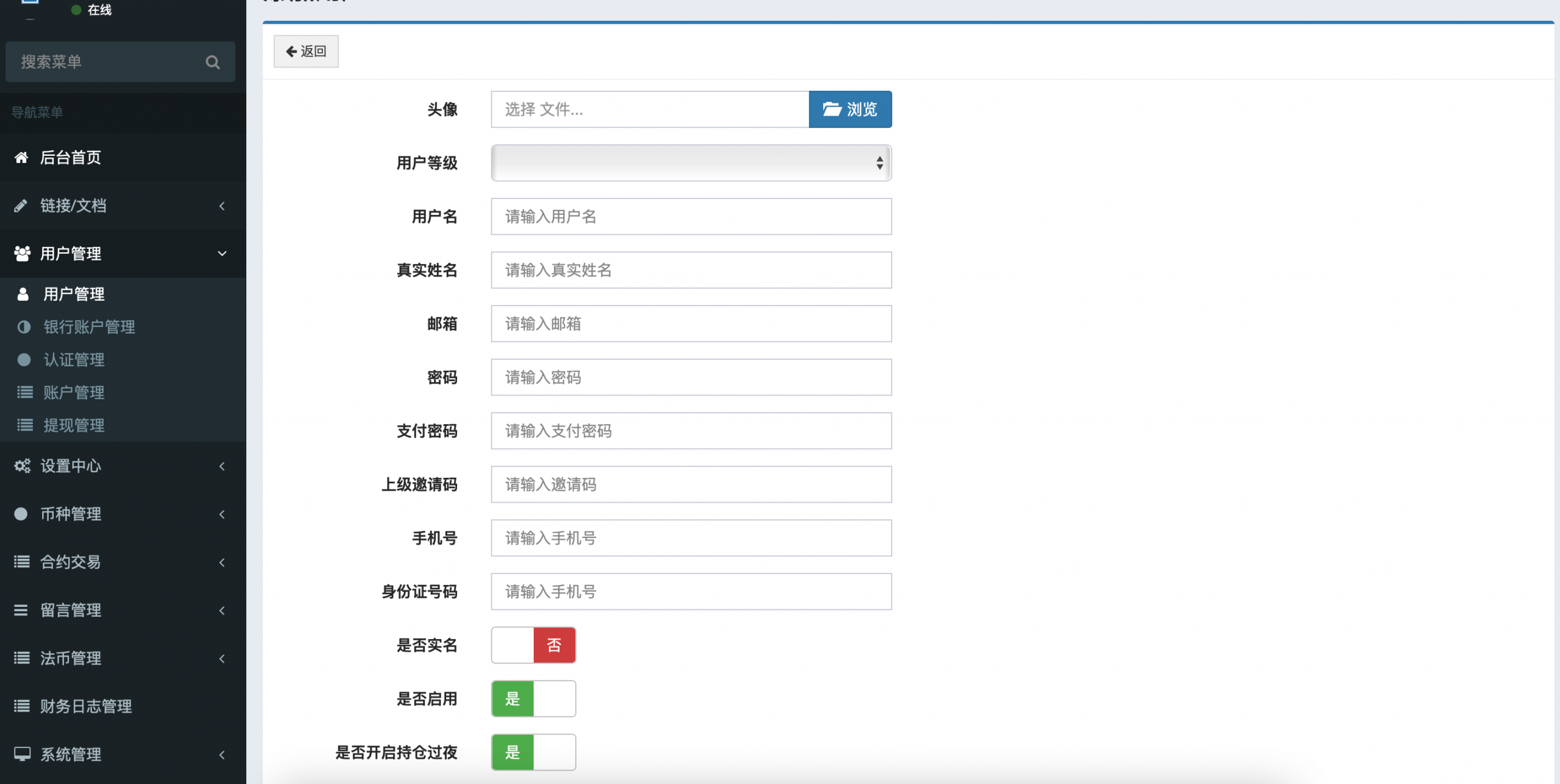 委托交易、合约交易、用户端三级分销、自带客服、可以无限自定义空气币、控制k线、虚拟k线。开发语言:安卓java、苹果Objective-C、总后台:Java