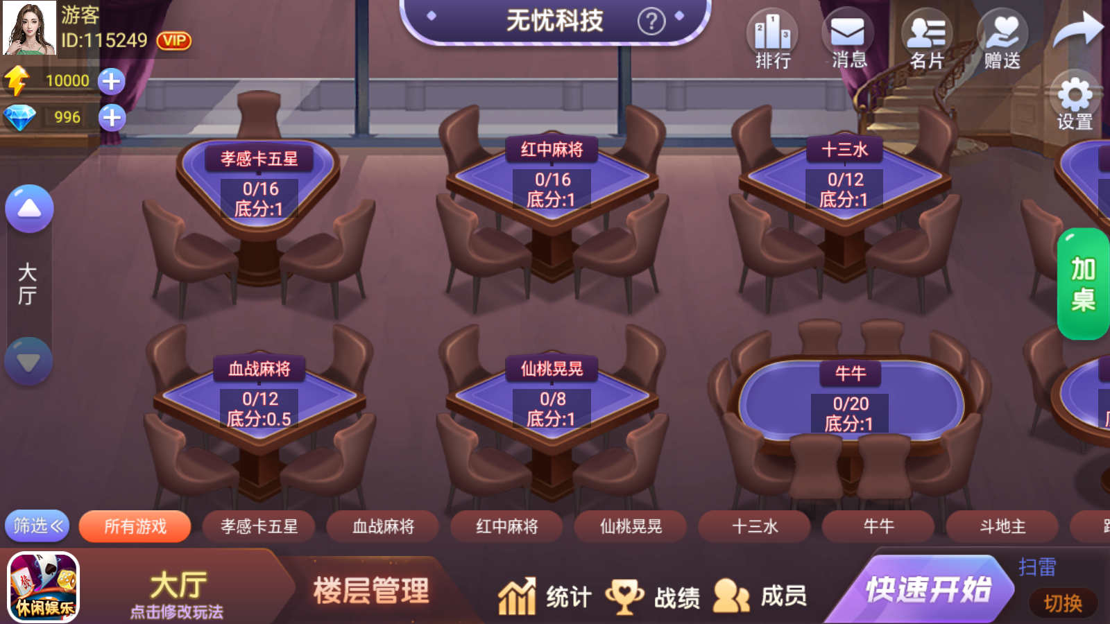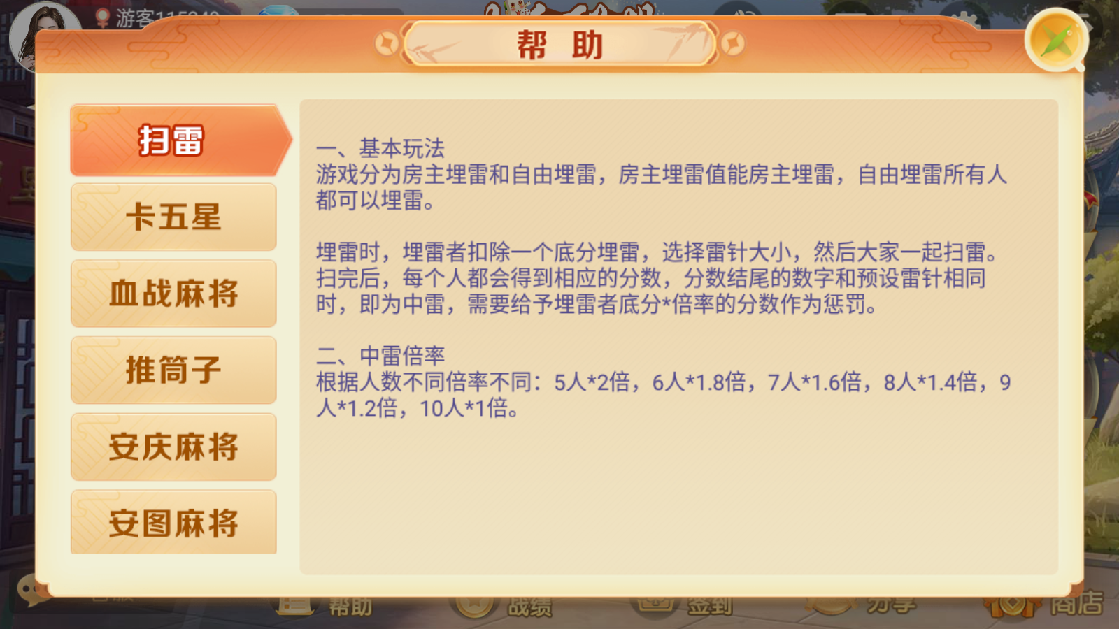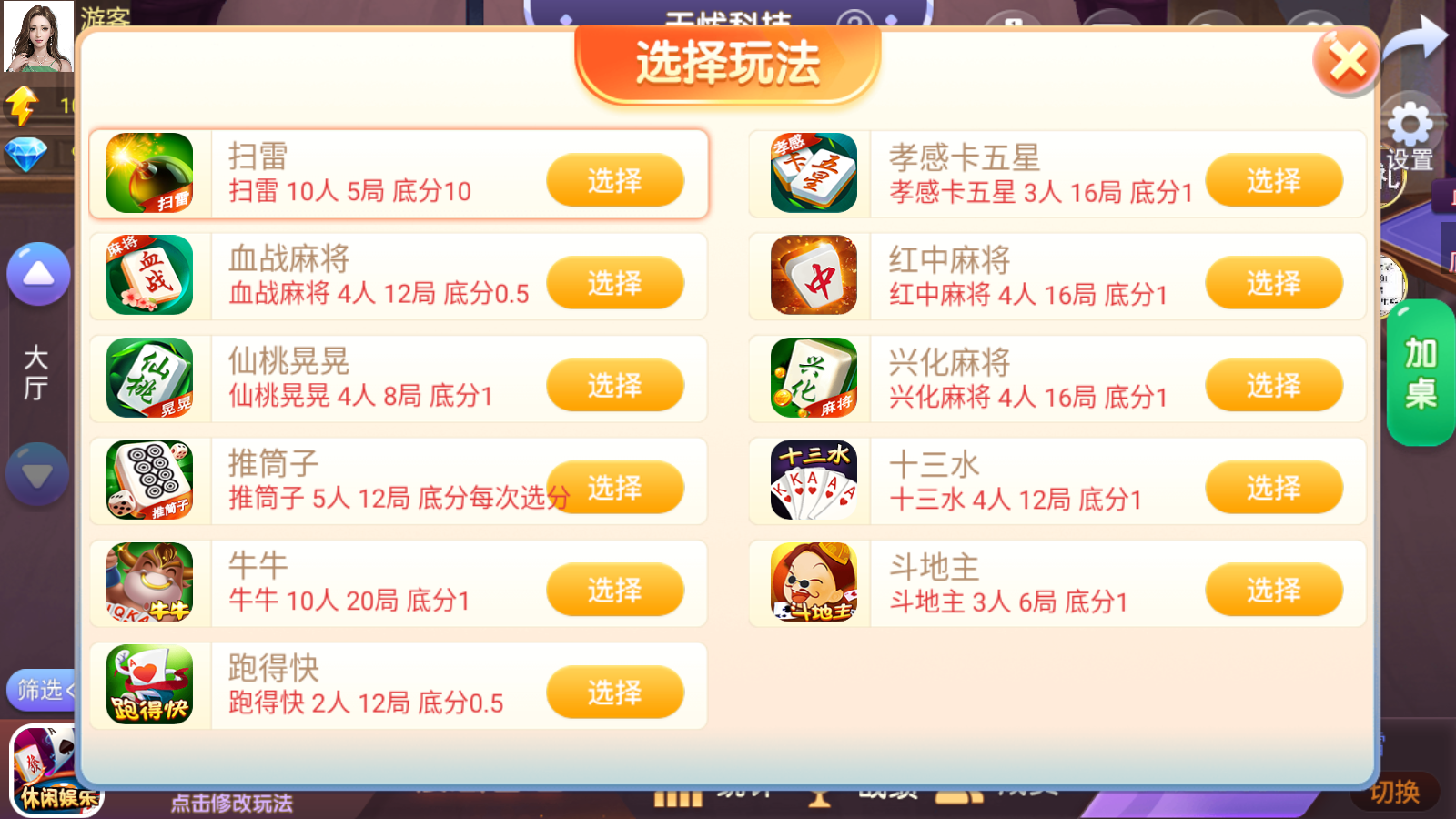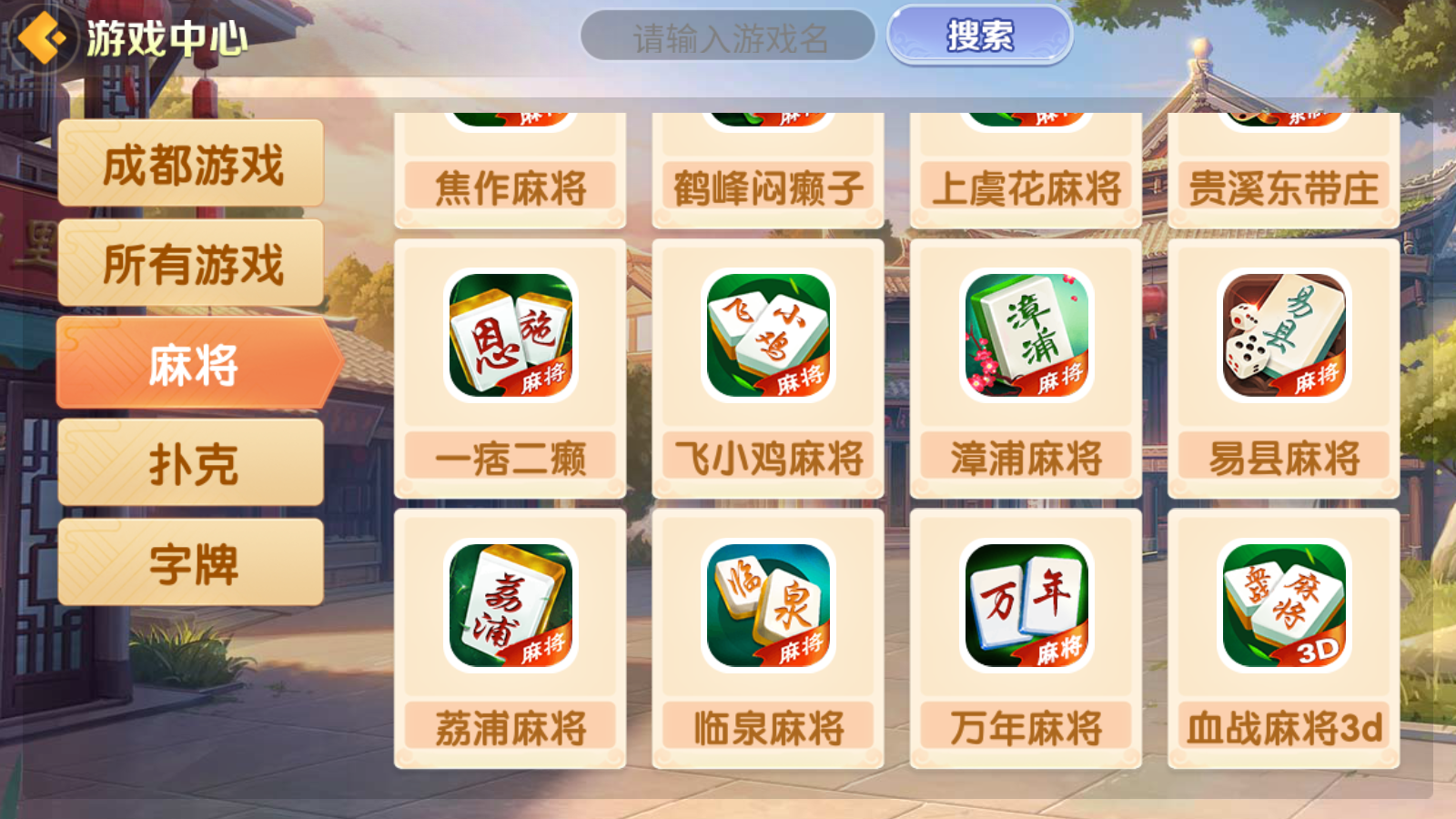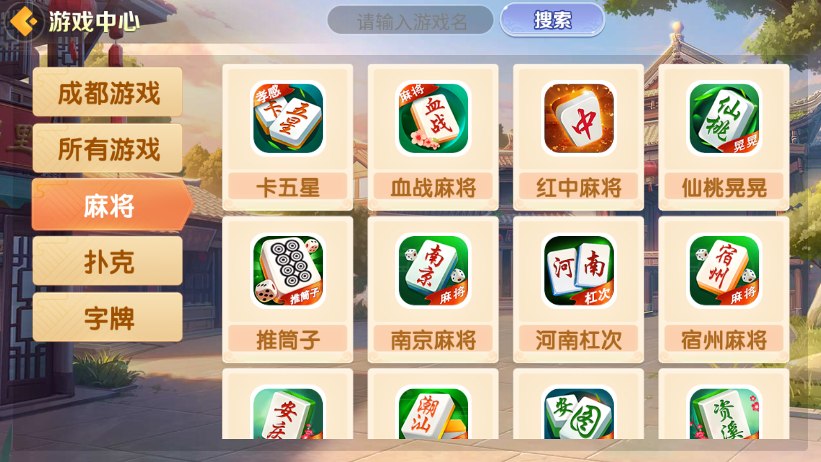 内含游戏:麻将:卡五星、血战麻将、红中麻将、仙桃晃晃、兴化麻将、推筒子、南京麻将、河南杠次、宿州麻将、安庆麻将、潮汕麻将、安图麻将、资溪麻将、焦作麻将、鹤峰闷癞子、上虞花麻将、贵溪东带庄、飞小鸡麻将、漳浦麻将、易县麻将、荔浦麻将、临泉麻将、万年麻将、血战麻将3D